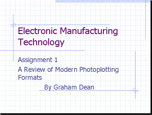 The objective of this report is to provide general information on the process of photoplotting and its data formats. The paper is intended to be short and give a basic understanding of the process and analyse the impact of EDA and PCB CAD/CAM. The author has no personal experience, as a user, of any of the formats covered in this paper. All the information has been gained from research and information supplied from knowledgeable and reliable sources. Before we are in a position to look at photoplotting formats, we will have to understand the fundamentals of a photoplotter, how it is controlled, and its role in EDA. No matter how powerful your design software may be, you will eventually create a photoplot file. In this report we will look at this file (called Gerber data) and its progression in PCB CAD/CAM in the development of new, more productive software.